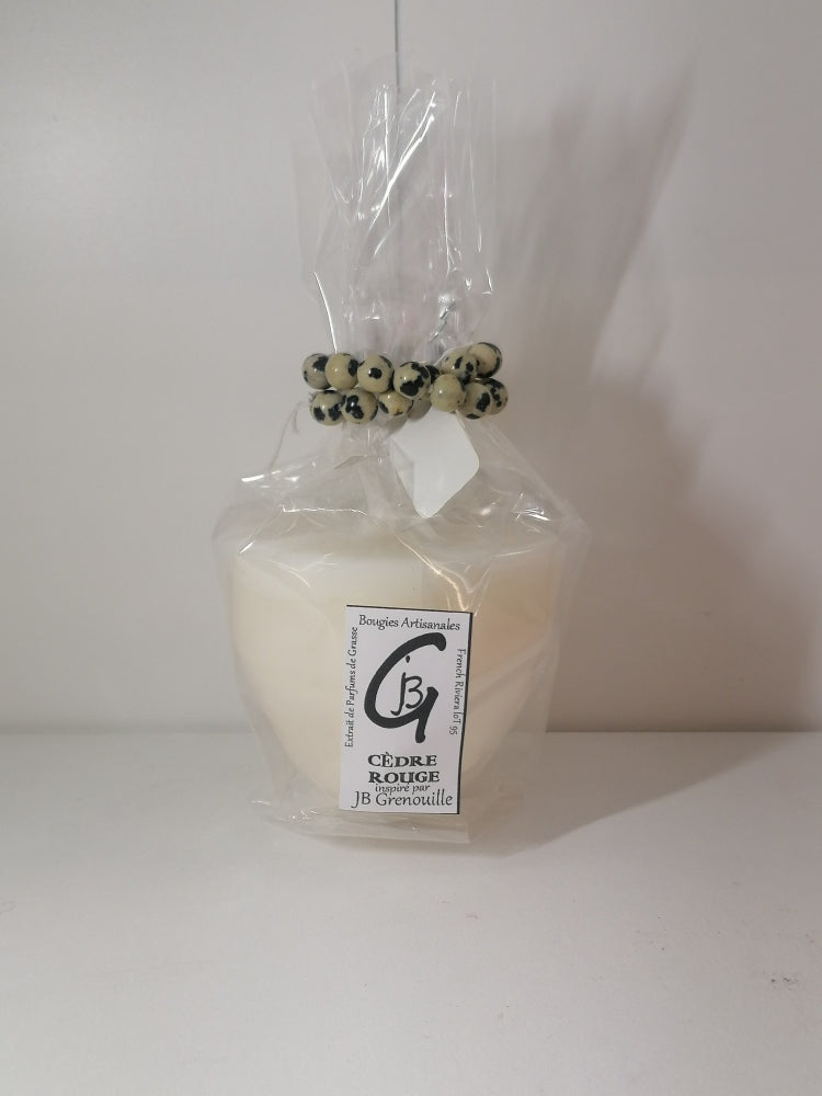 Cette bougie parfumée senteur Cèdre rouge recèle des notes de cèdre du Liban ET Cèdre de virginie plus doux, mélangées avec l'écorce d'orange ,la cannelle et une pointe de clou de girofle.